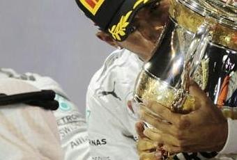 | Hamilton besa la copa como vencedor en Bahréin ante Rosberg - Reuters. |