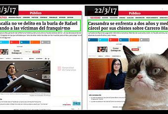 Pero hay más. No todos los casos se juzgan igual. Y para ver un ejemplo claro, podemos comparar dos casos. Cassandra Vera ha sido juzgada por decir que “ETA ha pagado el viaje a la luna a Carrero Blanco”, que era un dictador cruel, porque dice el fiscal que enaltece el terrorismo y ofende a las víctimas. Sin embargo, Rafael Hernando –portavoz del PP en el congreso, y por tanto con mucha más repercusión pública--, fue denunciado por su desprecio a las víctimas franquistas, a las que humilló con sus comentarios y resulta que ha sido declarado inocente. Por cierto, la misma nieta de Carrero Blanco --al igual que hizo Irene Villa en el caso del tuit del concejal Zapata--, se ha mostrado sorprendida y en contra de que un tuit sobre su abuelo, pueda acabar dando con los huesos de su autora en prisión.