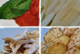 LASAGNA VEGETARIANA LIGHT Para 2 personas: 1 berenjena; 1 calabacín pequeño o medio grande; 1 bandejita pequeña de setas; 1 mozzarella light; 4 alcachofas naturales o 6 corazones de alcachofa en conserva; Queso rallado tipo Grana Padano o Parmesano; Sal; Pimienta negra; Sal gorda.Agua; Aceite de oliva. Para la salsa de tomate: 1 bote de tomate frito; 1/2 cebolla morada; 1 diente de ajo; Medio vaso de vino blanco; 1 puñado de hojas de albahaca; Sal; Pimienta Negra molida; Aceite de Oliva.