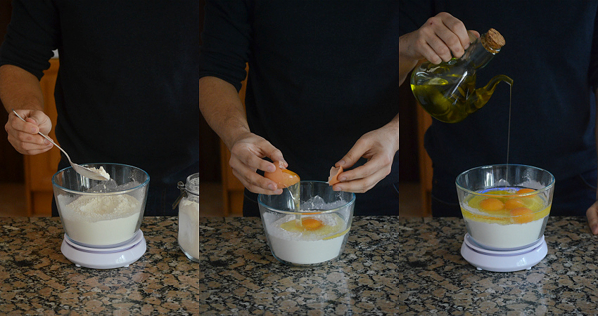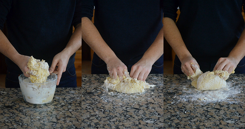 El truco esta en amasarla lo justo. Por ello trabajamos la masa doblandola desde fuera hacia adentro hasta tener una masa homogénea que no se nos pegue a la manos. La ponemos en un bol tapada con un trapo y la dejamos reposar durante 1 hora a temperatura ambiente.