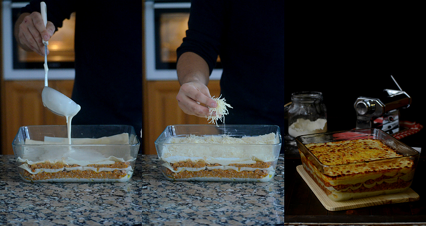 Después de pasarte más de tres horas en la cocina preparando una lasaña ya puede estar buena. Y la verdad que estaba deliciosa. No es porque la haya hecho yo, pero diría que es de las mejores que he comido. Y es que después de pasarte tanto rato cocinando, todo esfuerzo se ve recompensando cuando tu familia no deja ni rastro de la lasaña en el plato de lo buena que estaba.Se puede decir que es una lasaña 100% casera: el relleno de carne con tomate, la pasta fresca y la bechamel. Además de todo el curro que eso conlleva, imagínate el tener que hacer tu mismo las fotos. La estampa es para recordarla: con una mano amasando la pasta fresca y con la otra programando el temporizador de la cámara mirando que quedase bien enfocado donde iba a hacer las fotos.Después de hacer más de 120 fotos, entre las del paso a paso y las del resultado final, ha quedado una buena selección, dando lugar a un paso a paso de 30 fotos y un resultado que entra por la vista al momento. La verdad que lleva mucho curro, pero yo os animo a prepararlo en casa. Si preferís trabajar menos podéis comprar las láminas de pasta precocidas y solo tendréis que hacer el relleno y la bechamel.