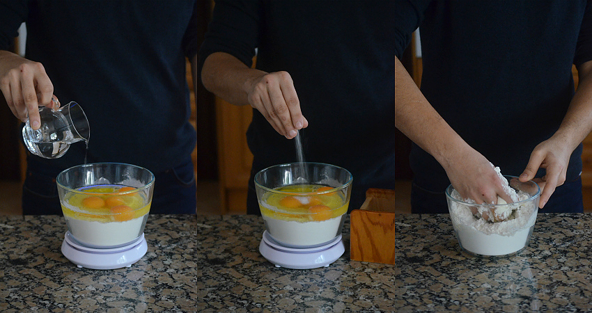 Pesamos los 9 gramos de agua tibia y añadimos una pizca generosa de sal. Ahora empieza lo divertido, manos a la masa. Podéis usar un tenedor para empezar a remover hasta que la masa no sea tan pegajosa o hacer como yo, directamente la mano al bol.