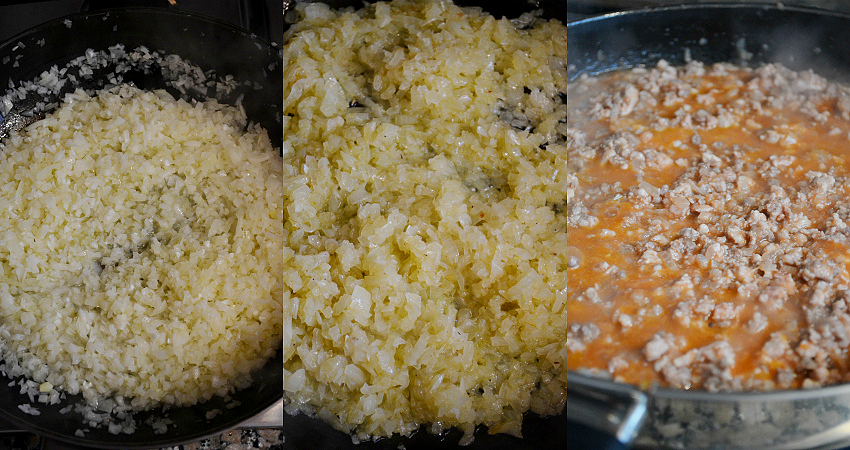 Una vez tengamos las dos cebollas cortadas en brunoise, ponemos un chorro de aceite en una sartén y a fuego medio vamos pochando las cebollas. Añadimos la carne y a fuego fuerte vamos removiendo hasta que cambie completamente de color. Vertemos el tomate triturado natural y salpimentamos al gusto. Dejamos a fuego medio que vaya reduciendo el agua que suelta la carne y el tomate removiendo de vez en cuando. Una vez haya reducido todo el líquido lo apartamos del fuego.Mientras el relleno se cuece, hacemos la bechamel (que fue lo único que lo hice las fotos del paso a paso). Ponemos a calentar la leche en una olla, mientras en otra olla derretimos la mantequilla y añadimos la harina. El proceso es tostar la harina con la mantequilla sin dejar de remover con unas varillas, esto hará de la bechamel no tenga sabor a harina. A esto se le llama hacer un roux. Vamos añadiendo la leche bien caliente sin dejar de remover. En principio la mezcla se espesará, pero seguimos añadiendo leche con un cucharón. Removemos hasta que la mezcla rompa a hervir que será cuando espese. Entonces podremos sacarlo del fuego, salpimentamos y añadimos la nuez moscada en polvo, y lo vertemos en un bol para que deje de cocer. Reservamos la bechamel.