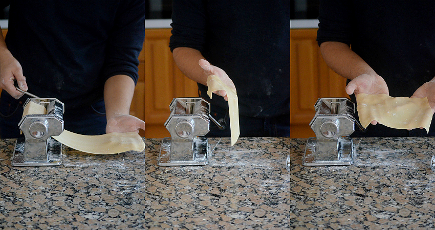 Mientras hemos preparado el relleno y la bechamel, la pasta fresca ya habrá reposado. Dividimos la masa en unas cuatro porciones para que nos resulte más fácil a la hora de trabajar.Para estirar la pasta necesitaremos una maquina especial para esto. Se puede hacer manualmente con el rodillo, pero no conseguiremos el mismo grosor en toda la masa, y además es un esfuerzo físico que con una maquina de estirar pasta nos lo podemos ahorrar. Espolvoreamos la masa con abundante harina y la pasamos por el nº 0. La doblamos por la mitad como si de un libro se tratase y la volvemos a pasar bien espolvoreada con harina. Esto le dará consistencia a la masa en caso de habernos quedado muy floja. Después de doblar la masa unas 5 veces como mínimo vamos pasándola por más números, de menos a más para conseguir un grosor óptimo y que no se nos rompa la masa.