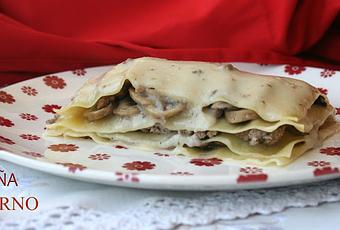 Empieza montando una capa de lasaña,carne, otra placa,champiñones con jamón y así sucesivamente hasta terminar los ingredientes.