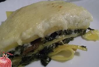 - Se monta la lasaña engrasando una fuente apta para el horno y poniendo capas de pasta con el revuelto de espinacas y lonchas de queso terminando con una de pasta y cubriendo todo con la bechamel y queso rayado.