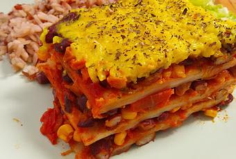 Para la lasaña:♥1 paquete de tortillas de trigo (10 unidades)♥2 tazas de judías rojas cocidas♥2 tazas de tomate triturado♥1 lata de maíz♥1 cebolla♥1 zanahoria♥1 cda de azúcar marron♥1 chili pequeño o guindilla (opcional)♥2 dientes de ajo♥2 cdas de aceite♥sal♥queso vegano rallado o queso vegano de patata (ver receta)Para el queso vegano de patata:♥2 patatas♥1 zanahoria