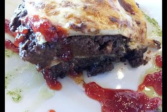 Ahora en una fuente de horno ponemos una placa de lasaña, una parte de la mezcla de morcilla, otra placa así hasta completar la fuente. Ahora vertemos la lasaña por encima e introducimos en el horno precalentado a 180ºC durante 30 minutos.