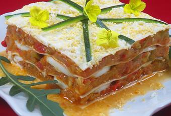 3- En la base del plato o fuente, extender una capita fina de mahonesa. Placa de pasta, pisto, y sobre la mitad de altura, intercalar láminas de huevo cocido.
