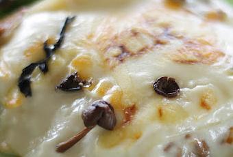 Así repetimos la operación hasta la última capa, que cubriremos con una abundante capa de bechamel y queso rellado o queso para fundir. También pondremos agunas setas más para decorar.