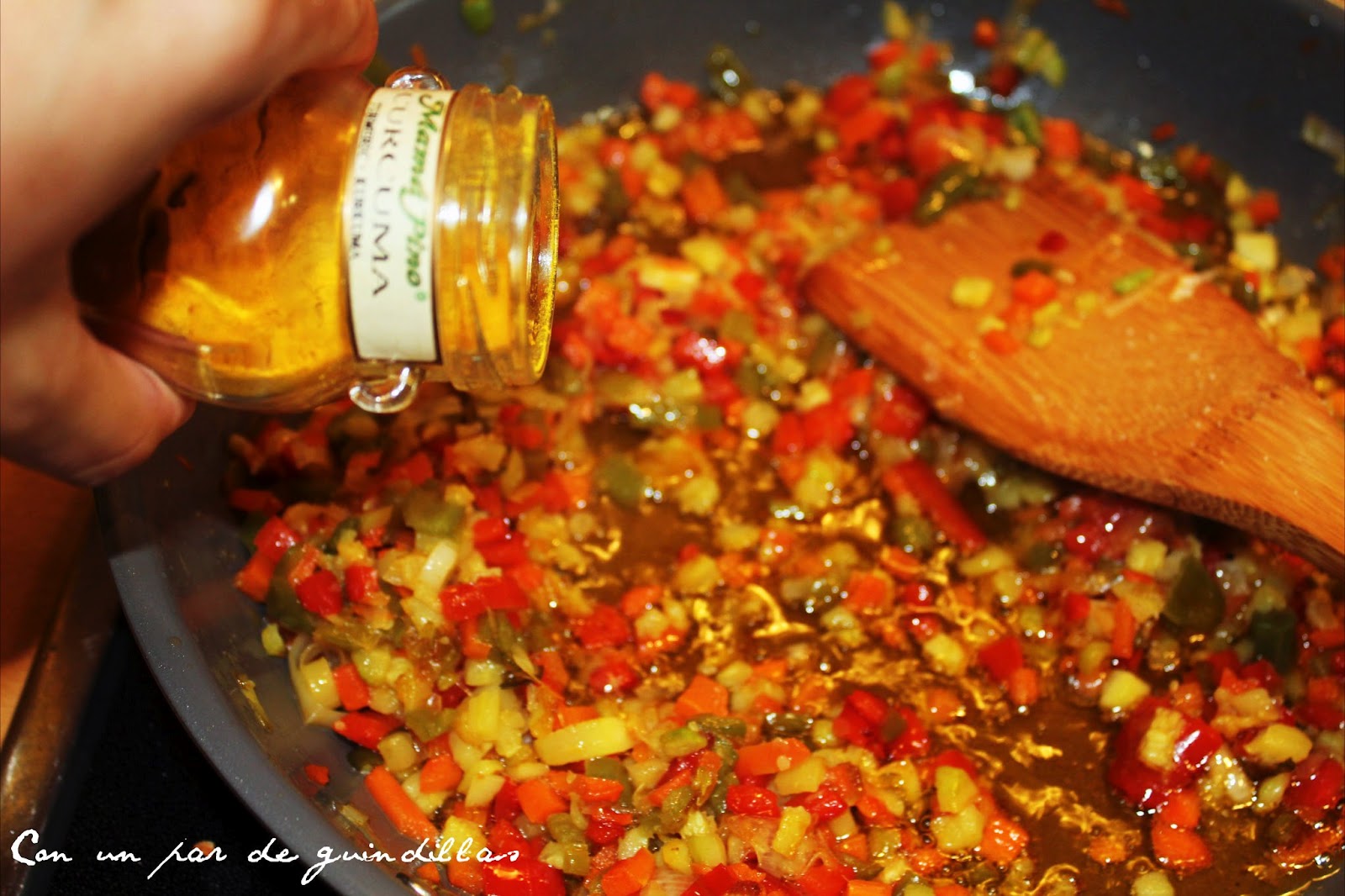 2.- Juntamos las verduras y las pochamos en una sartén con aceite a fuego lento. Cuando estén a punto les añadimso sal y cúrcuma al gusto. Reservamos.