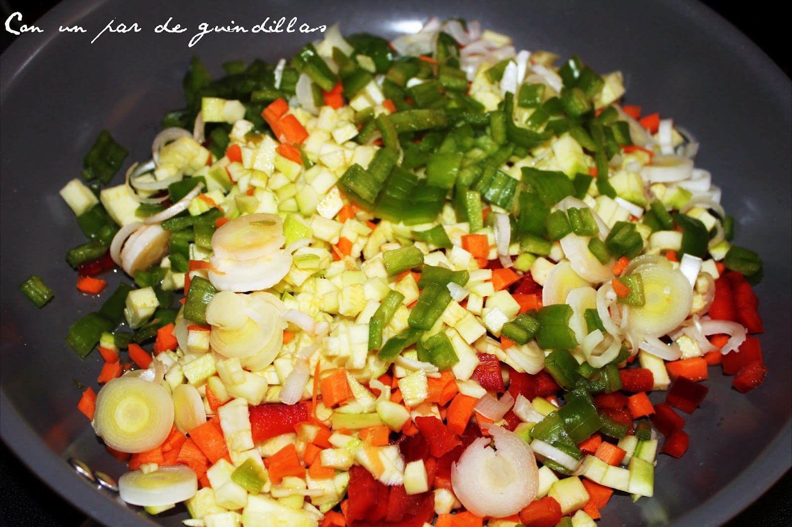 1.- Cortamos en brunoisse las zanahorias, los pimientos y los calabacines. Picamos el puerro en aros finos.