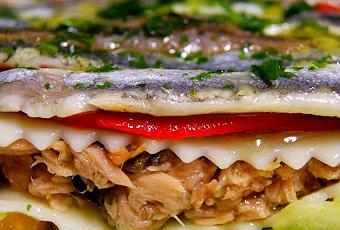 En el último piso, colocamos sobre la última lámina de pasta los pimientos del piquillo estirados, sobre ellos los boquerones y las anchoas en salazón y todo ello lo condimentamos con perejil picado y la vinagreta de mostaza.