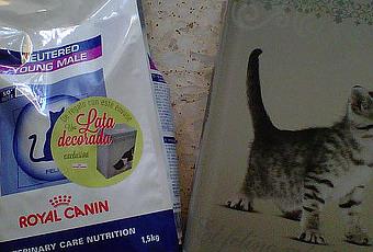Para los que siempre me decís que me regalan mil cosas, también os diré que compro cosas como la comida de Royal Canin, que regala esta lata de metal decorada con la foto de este gatito, por detrás tiene otro, para meter dentro la comida de mi gato.