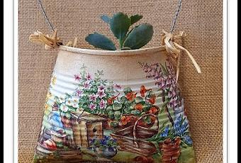 Con una broca finita le hice unos agujeros laterales para poder colgarla y con dos alambres enrollados formé el asa y la sujeté a la lata. Unos lazos de rafia y aquí está el macetero, ya está colgado en la terraza. Me encanta como ha quedado. Estoy haciendo otro para que le haga compañía.