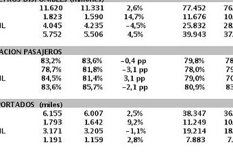 El tráfico de pasajeros aumentó 2,0%, mientras que la capacidad aumentó 2,6%. Como resultado, el factor de ocupación para el mes disminuyó 0,4 puntos porcentuales a 83,2%. El tráfico internacional de pasajeros representó aproximadamente un 50% del total del tráfico de pasajeros del mes.