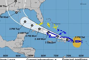 A las 5 de la tarde de este sàbado, el centro de la tormena tropical Laura, se encontraba a unos 70 kilòmetros al este sureste de la República Dominicana, en la latitud 17.8 Norte y longitud 67.5 Oeste, con vientos de 85 kilòmetros por hora y un desplazamiento de 30 kilòmetros por hora, en curso oeste.