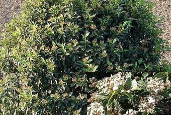 Arbusto perenne muy ramificado, de copa globosa, densa y oscura. Posee hojas aovadas, aovado lanceoladas y elíptico oblongas; discolores, verdes-oscuras en la parte superior y más claras en la inferior, pilosas o glabras. Sus flores son blancas y están agrupadas en densas cimas redondeadas terminales. El fruto es una drupa azul-oscuro, que persiste bastante en la planta y no es comestible. Se reproduce por estacas, injerto y semillas.