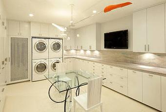 ¿Cómo es un lavadero en una casa de 43 millones de dólares? Aquí hay una foto que supera lo imaginado para un cuarto que usualmente es pequeño, predominantemente funcional y en donde uno no espera encontrar diseño sofisticado. Pero en este caso vemos una mesa de trabajo de cristal transparente con patas formadas por ruedas de bicicleta. Muebles de lavadero extra large y máquinas para lavar la ropa de diseño en apariencia avanzado de gran calidad.
