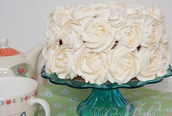 Metemos en la nevera una media hora, mientras preparamos nuestra manga con boquilla 1M para hacer las rosas. La rellenamos de crema de chocolate blanco y cuando nuestro bizcocho esté bien frío adornamos con rosas.