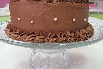 La tarta de este cumple era de bizcocho de dos sabores, vainilla y caramelo, bañado con almíbar de vainilla y un buttercream de chocolate fondantEl bizcocho lo hice mezclando las dos cremas, la de vainilla y chocolate para que se quedara a manchas y la tarta la dividí en tres para que tuviera bastante relleno de chocolateComo casi siempre, bañé cada pieza de bizcocho con almíbar para que quedara jugosa y después la rellené y cubrí bien con la crema de chocolate