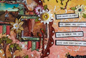 Un journaling escrito a mano y recortado con una frase que me encanta, traducida dice: "Tu corazón es libre, sé valiente y escúchalo, trata de alcanzar el cielo con los pies en la tierra".