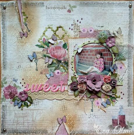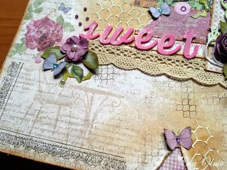 El papel de base que he utilizado es de Maja Design, de la colección Coffee in the Arbour.Para realizar el fondo apliqué unos sellos, un poco de tinta y pasta de relieve con una plantilla de celdillas hexagonales.