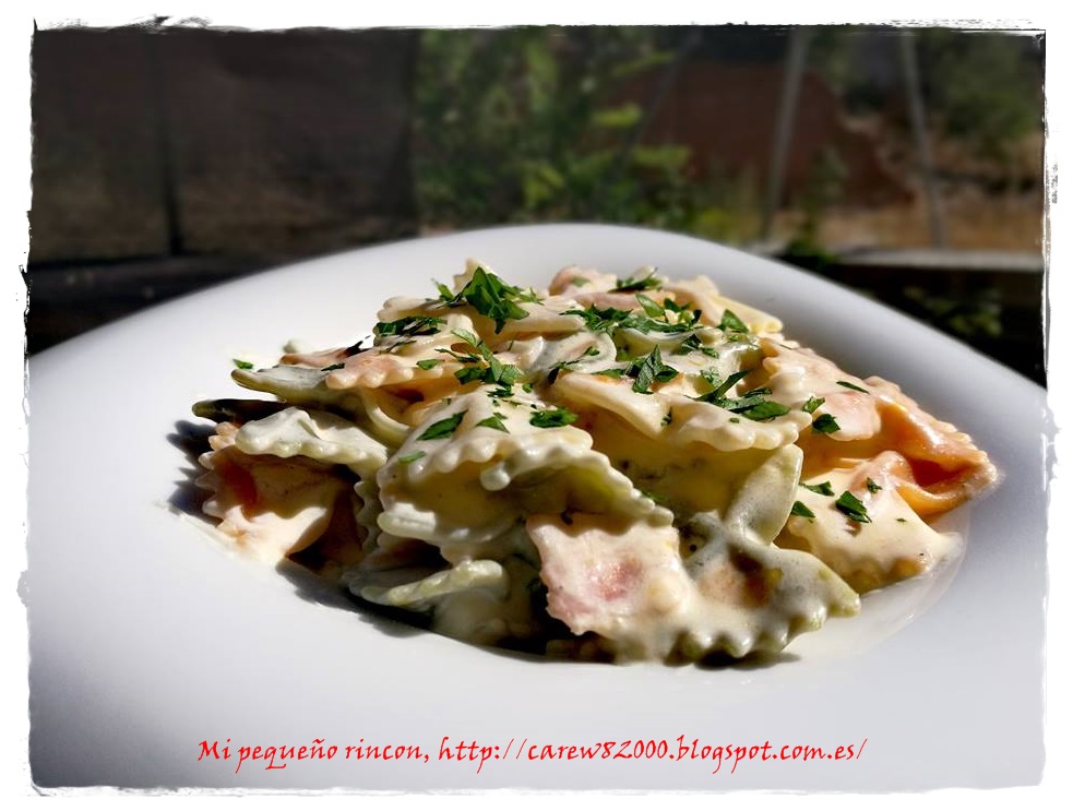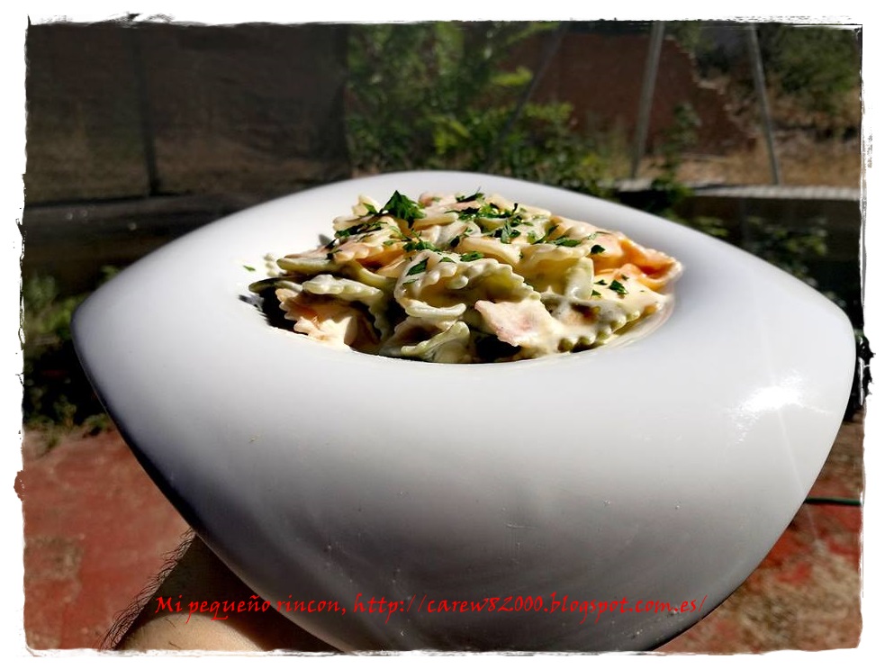 Añadimos la cebolla y el bacón y por último los lazos cocidos, le damos unas vueltas y retiramos del fuego unos minutos, pasado ese tiempo servimos.