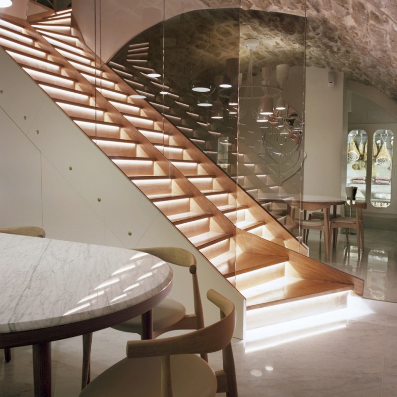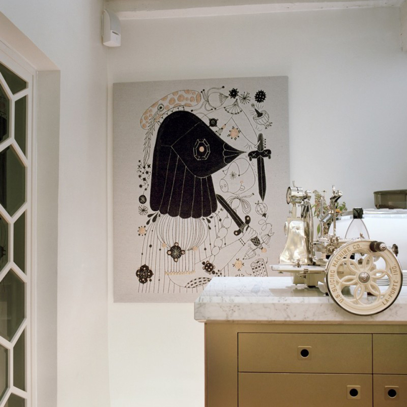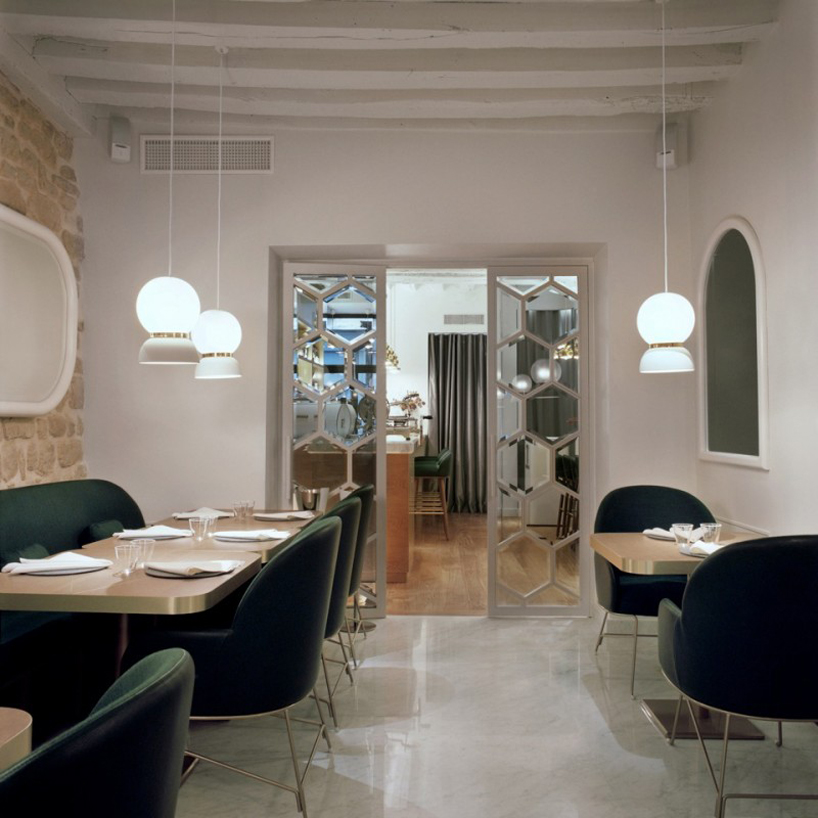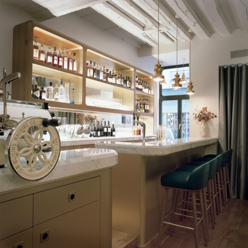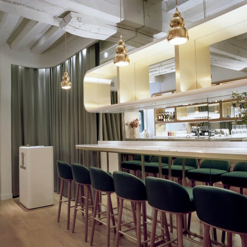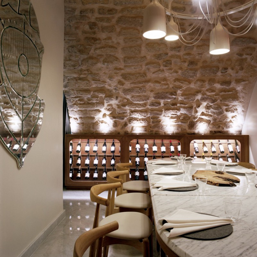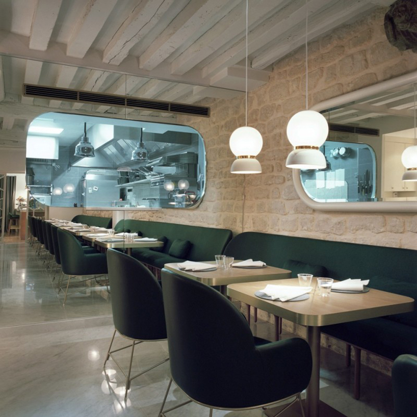 Jaime Hayon en un proyecto en París. No pueden ser mejores partes para una ecuación con excelente resultado. En este resultado de dos plantas, baja y sótano, encontramos materiales naturales en techos de viguería de madera,paredes de piedra natural y suelos de mármol. Todo ello se ha enlazado de tal manera que el efecto que se transmite es el de la elegancia y la calidez. Los elementos elegantes del proyecto son los dorados en lamparas y accesorios junto con a la riqueza del verde del tapizado en las sillas. Un lugar del que tomar muchos apuntes. Bodega: Vía: Designboom