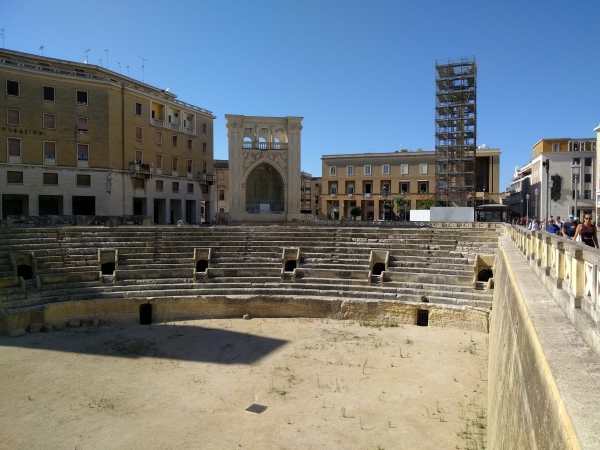 En uno de los costados del anfiteatro está la columna de San Oronzo el patrón de la ciudad.