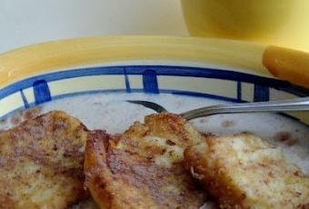 - Cuando esté frío, cortar con un cuchillo en cuadraditos. Rebozarlos en harina y huevo batido, y freírlos en abundante aceite. Escurrirlos sobre papel absorbente para quitar el exceso de aceite y en seguida pasarlos por una mezcla de azúcar glas y canela molida. Servirlas sobre un fondo de natillas.