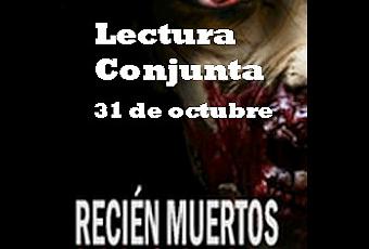 Buenas a todos!!Pensabais que ya no me iba a pasar por aquí hoy ¿a que si? Pues, sí si que me paso a comentaros una iniciativa ala que me he apuntado. Se que os comentaba la semana pasada que no me iba a puntar a ninguna otra Lectura Conjunta, pero es de zombies y para celebrar Halloween, en fin que me ha sido totalmente imposible resistirme jejeEl blog organizador es el de Kayena: Negro sobre blanco, y el libro en cuestión es una antología de relatos: Recién muertos ¡Escalofriante el título ¿no?!! jej Me lo voy a pasar pipa leyendo este libro, estoy completamente segura.También quería comentaros que el libro lo proporcionará Kayena en formato electrónico a todos aquellos que decidan participar, y además de esto se sorteará entre los participantes un ejemplar de "Muerte en primera clase" de J.M Guelvenzu.