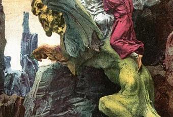 A) Mira la imagen de arriba y contesta: 1. ¿A qué canto pertenece la escena que ilustra? 2. ¿Cómo se llama ese ser prodigioso sobre el que van subidos Dante y Virgilio? 3. Dante lo califica como “la sucia imagen del engaño”. ¿A qué crees que es debido? 4 Para describir cómo nada esa criatura en el aire, Dante usa un símil espléndido al final del canto XVI. Cítalo. 5. La imagen que vemos arriba no es completamente fiel al poema porque Dante cuenta que él iba sentado delante y Virgilio detrás, mientras que en la imagen es al revés: ¿Verdadero o Falso? 6. El miedo que siente Dante antes de subirse en ese monstruo lo expresa de nuevo con un símil: "Como el que siente ya el escalofrío...” Complétalo. 7. ¿Qué aspecto físico tiene esa criatura? Descríbela. 8. Para expresar lo mal que lo está pasando ahí arriba, Dante alude a Faetón y a Ícaro. Explica muy sucintamente estos dos mitos, y busca en Internet sendas imágenes que los ilustren y adjúntalas.B)Completa el siguiente crucigráfico con la ayuda de las ilustraciones que se muestran en este enlace (solo para participantes inscritos). Para mayor comodidad, se recomienda imprimirlo, rellenarlo y hacerle una foto, que será la que se envíe adjunta.