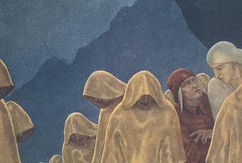 A) Di si son verdaderas o falsas estas afirmaciones relacionadas con la escena que plasma la imagen de arriba: 1. Los condenados con los que se encuentran Dante y Virgilio son los hipócritas. 2. Llevan capas con capuchas bajas hasta los ojos, de la misma hechura que las de los monjes de Chartres. 3. Por fuera, las capas son doradas y, por dentro, de hierro caliente. 4. Tan pesadas son que “eran de paja las de Federico”. 5. Estos condenados dan vueltas a lentísimo paso, y lloran abatidos y fatigados. 6. Los demonios que vemos arriba en el precipicio no han seguido a nuestros protagonistas porque la divina providencia ordena que los custodios de la quinta fosa no pueden salir de su recinto. 7. El crucificado de la imagen es Caifás, “aquel que aconsejó a los judíos dar muerte a un hombre por el bien del pueblo”. 8. También está por allí su suegro, Cleofás, y todos los que “sembraron en aquel concilio mala semilla para los judíos”. 9. El clavado está en medio del camino e incesantemente es pisoteado por todos los que pasan. 10. Virgilio observa atentamente al crucificado, sin inmutarse. 11. La pareja de condenados que está junto a Dante y Virgilio son dos frailes boloñeses llamados Catalano y Gardingo. 12. Ambos fueron escogidos como garantes de la paz en Florencia. 13. Es Catalano quien le indica a Virgilio el camino para vadear los tristes fosos y evitar que los demonios los atrapen por el aire. 14. Aunque el puente esté roto, podrán escalar por el derrumbe que yace en la ladera. 15. Dante se da cuenta del engaño del demonio Malacola diciendo: “El que aquí ensarta pecadores, no nos explicó muy bien todo el asunto”.
