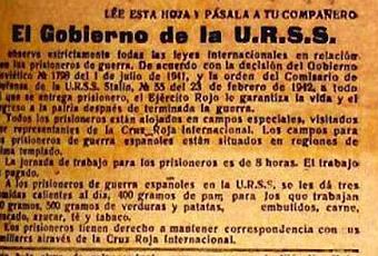 A los prisioneros de guerra españoles en la URSS se les da 3 comidas calientes al día, 400 gramos de pan, para los que trabajan 800 gramos, 300 gramos de verduras y patatas, embutidos, carne, pescado, azúcar, té y tabaco.