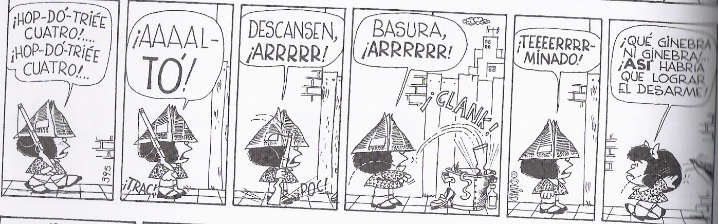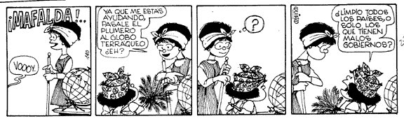 Os lo recomiendo encarecidamente. Reiréis y aprenderéis con la visión del mundo de Mafalda y sus amigos. Seguro que muchos conocíais de la existencia de esta niña que parece disfrutar realizando profundas preguntas (de esas que requieren buenas dosis de reflexión antes de ser contestadas) a sus padres y profesores, pero puede que no todos la hayáis leído a conciencia. A mi se me ocurrió hacerlo apenas dos meses atrás, y fijáos si me gustó que se ha ganado una entrada. Las viñetas del humorista Quino son también interesantes como documento histórico, pues reflejan desde la preocupación ante el armamento atómico, o ante el imparable ascenso de China, hasta el conflicto de Vietnam o la interiorización de la idea de un mundo bipolar, pasando por la problemática interna de la misma Argentina. Todo en clave de humor, a través de las afiladas críticas que Mafalda lanza con sus preguntas inocentes (...¿o no tan inocentes?) Qué mejor que dejar unas cuantas viñetas para demostrarlo: En fin, a mí me ha conquistado. Saludos