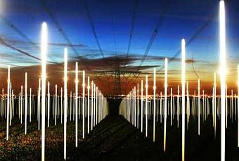 Foto: Instalación del artista inglés Richard Box con tubos fluorescentes bajo líneas de alta tensión