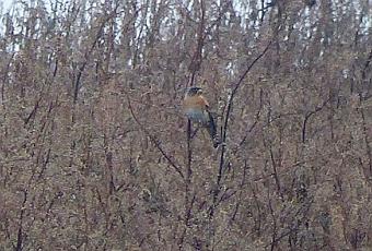 Afortunadamente se trataba de un macho, con una fuerte pechera anaranjada y la cabeza oscura y por ello bastante identificable. Tras hacerle estas "fotos" tan lejanas, traté de relocalizarlo, sin éxito.