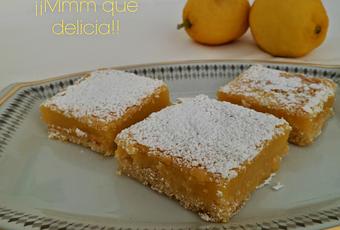 La idea de este concurso comenzó el año en que se inaguró la sección bilingüe en el instituto y llegaron dos profesoras nativas para ayudar en las clases. Ellas junto con el departamento de inglés son las que organizan el concurso. Para ello, una serie de alumnos se presentan voluntarios y las profesoras se encargan de repartir las recetas, en inglés, que deben hacer. El año pasado le tocó realizar las sugar cookies (galletas de azúcar), el anterior las chocolate chip cookies (cookies) y el anterior las rice krispies treats (barritas de cereales). Siempre le decimos que elija algo distinto para aprender dulces típicos americanos o ingleses y por eso este año eligió los lemon bars. Cuando la hizo Alberto, bueno le ayudamos, el resultado no fue satisfactorio pues usamos un molde grande y quedaron muy finas, a parte que no sé que pasó pues la base salió a flote y de hecho le tuvimos que dar la vuelta para decorar los cuadradillos, ahora bien, la decoración preciosa, Ana hizo unos limoncitos de fondant con hojitas y todo.Nos quedó un resquemor de por qué no habían salido bien y es que la cocina es lo que tiene, que algunas veces no salen las cosas como una planea. Los hemos hecho de nuevo y este ha sido el resultado, totalmente satisfactorio, con ese toque un pelín ácido del limón. A mi me han encantado pero a mi hija Ana no tanto, pero claro a ella no le hace mucha gracia el limón.