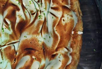 Cubrimos por encima de la tarta haciendo picos con la ayuda de una cuchara. doramos con el soplete de cocina, espolvoreamos ralladura de lima por encima del merengue.