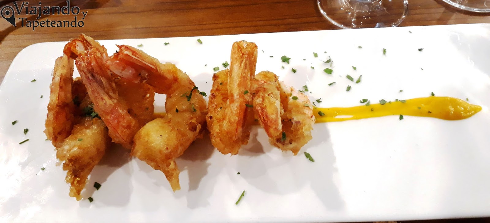 - Langostinos Fritos, con Crema de Zanahoria y Comino... bueno, un plato normal. Seis langostinos rebozados.