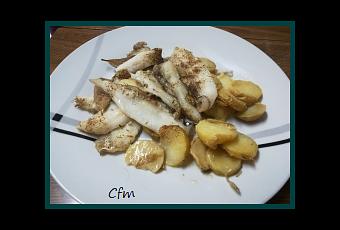 -Lenguadinas en filetes-500 gr de patatas cocidas (RECETA)-1 cebolla en rodajas-Aceite de oliva-1 chorrito de vino blanco-Sal-Pimienta-Perejil -2 ó 3 dientes de ajo pelados