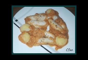 -Picamos la cebolla, el ajo y el perejil y lo pochamos durante 10 minutos en una cazuela con un chorro de aceite-Añadimos la harina y dejamos que se tueste un rato-Añadimos el pimentón y el vino blanco, y dejamos cocinando hasta que se evapore el alcohol-Añadimos poco a poco el fumet de pescado mientras se va liagando la salsa y dejamos cocinando cinco minutos-Limpiamos y salamos el pescado y lo añadimo a la cazuela-Dejamos cocinar 10 minutos a fuego medio y reposar otros 5 minutos