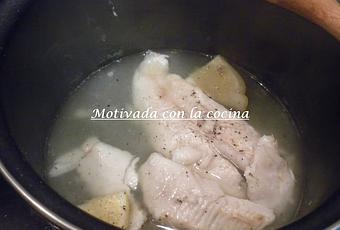 3. Se añaden los filetes de lenguado, y se añade agua hasta que se cubran.