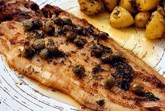 La salsa meunière consiste en una salsa de mantequilla, limón y perejil. En algunas ocasiones se incorporan alcaparras y como guarnición siempre he visto que ponen patatas cocidas.
