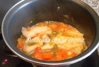 Se añade caldo de pescado o de verduras, hasta cubrirlo y se deja cocer durante 10 minutos.