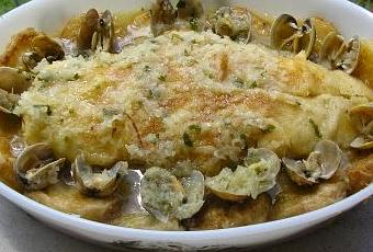 - Colocamos el lenguado en una fuente, y sobre él vertemos la salsa, colocamos las patatas y las almejas a su alrededor, y antes de servir lo metemos al horno precalentado a 200º unos 15 minutos para que todo se caliente a la vez y el lenguado absorba el sabor de la salsa.