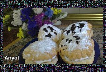 Abre cada pieza de hojaldre con un cuchillo de sierra y rellenalo de merengue. Espolvorealo de azucar glass por encima.