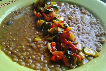 - Cuando estén cocidas las lentejas mezclamos la mitad de las verduras con el potaje y el resto lo dejamos para decorar al servir ......