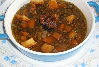 Ingredientes:200 gr de lentejas pardinas 2 cebollas 1 zanahoriacaldo de verdura1 morcilla (yo se la puse de cebolla, pero poner las que mas vos guste)tomillo2 clavos de olorunas rebanadas de panpimentónaceite de olivasal